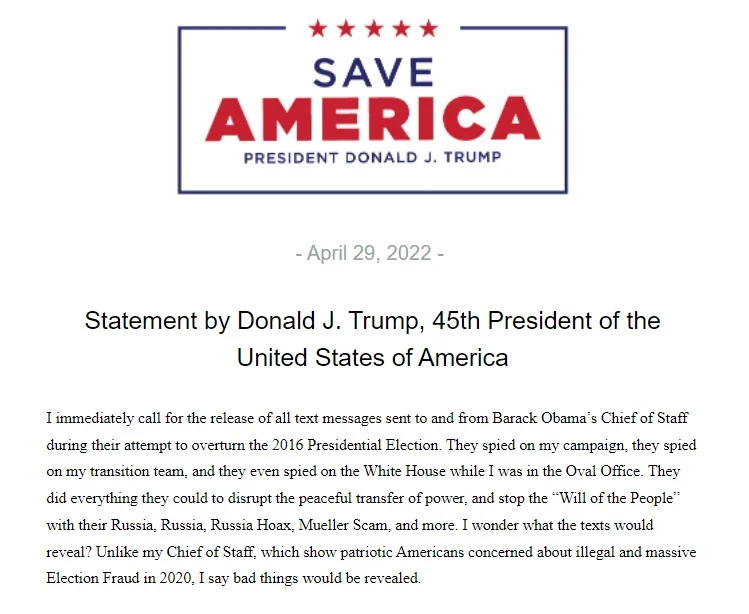 Je demande la publication immédiate de tous les messages texte envoyés au et par le chef de cabinet de Barack Obama pendant leur tentative de renverser l’élection présidentielle de 2016. Ils ont espionné ma campagne, ils ont espionné mon équipe de transition, et ils ont même espionné la Maison Blanche pendant que j’étais dans le Bureau Ovale. Ils ont fait tout ce qu’ils pouvaient pour perturber le transfert pacifique du pouvoir, et arrêter la “Volonté du Peuple” avec leur canular sur la Russie, la Russie, la Russie, l’arnaque Mueller, et plus encore. Je me demande ce que les textes révéleraient ? Contrairement à mon chef de cabinet, qui montre des Américains patriotes préoccupés par la fraude électorale illégale et massive en 2020, je dis que de mauvaises choses seraient révélées.