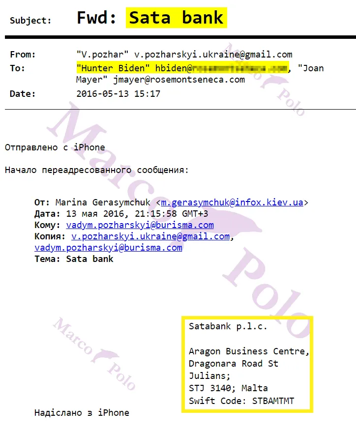 7) Un avocat de Burisma a envoyé un courriel à Hunter, lui communiquant l’adresse et le code swift ℹ️ de Satabank ℹ️, la banque maltaise.
